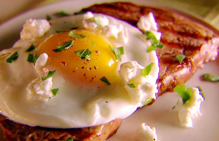 Se asaza biftecele pe farfurie, punand peste fiecare cate un ou.
