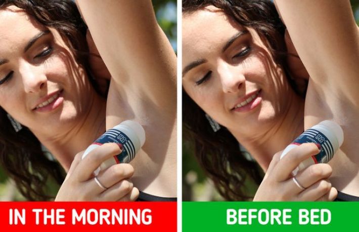 1. Aplicarea deodorantului in timpul zilei. Deodorantul este un prieten de nadejde.. Ne fereste de momentele stanjenitoare din societate, mai ales in locuri precum lifturile. Stiai, insa, ca ar trebui sa il aplicam noaptea? Deodorantele obisnuite nu ajuta, de fapt, la combatarea transpiratiee, ci doar mascheaza putin mirosul. Pe de alta parte, antiperspirantele astupa temporar glandele sudoripare, astfel incat transpiram mai putin intens. Ingredientele active din antiperspirante au o sansa mai mare de a intra in glande pe timp de noapte!