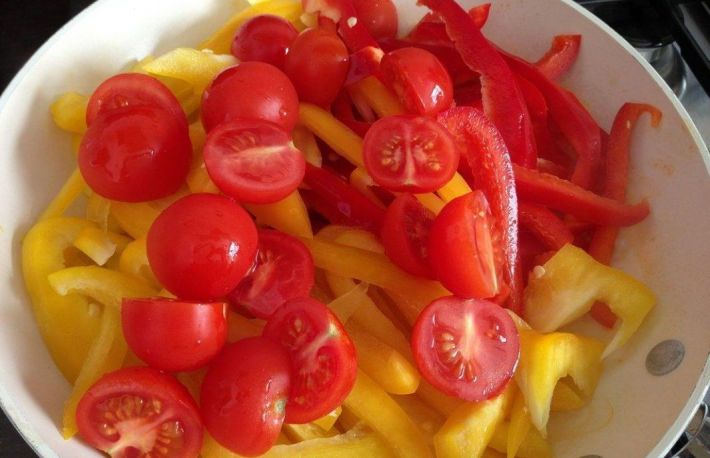 Se spala si se curata mai multi ardei grasi care se taie de asemenea in jumatate, iar apoi in felii subtiri ca fideaua.