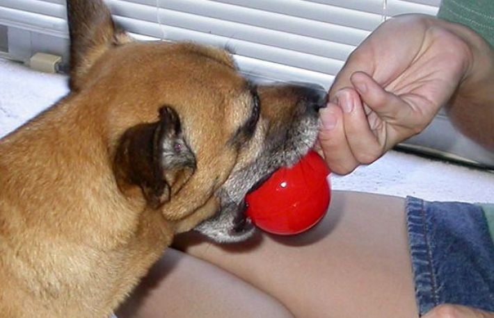 Alegeti o jucarie preferata de caine, pe care acesta o tine mult in gura si cu care ii place sa se joace.