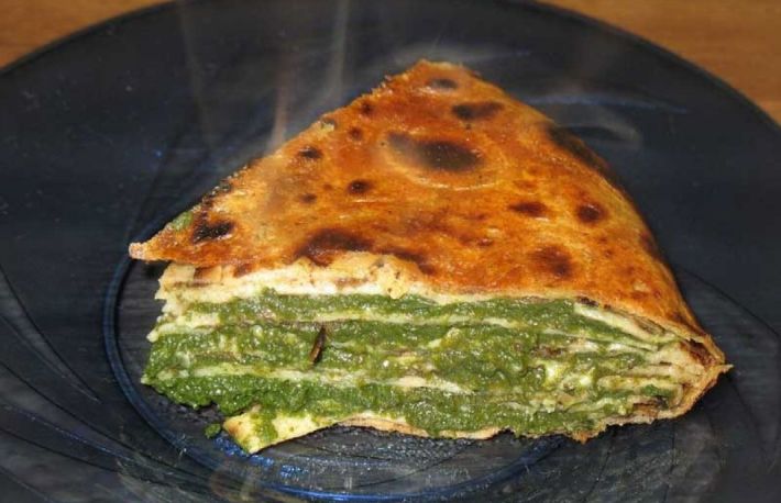 Se pune un strat de piure de spanac, o clatita si asa mai departe, pana cand se umple cratita.