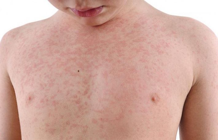 - eruptie cutanata rosie. Acesta este primul smen in cazul celor care dezvolta simptome, pentru ca, de multe ori, simptomele lipsesc. Eruptia se dezvolta mai intai la nivelul fetei, raspandindu-se apoi pe tot corpul. Dureaza cam 3 zile;