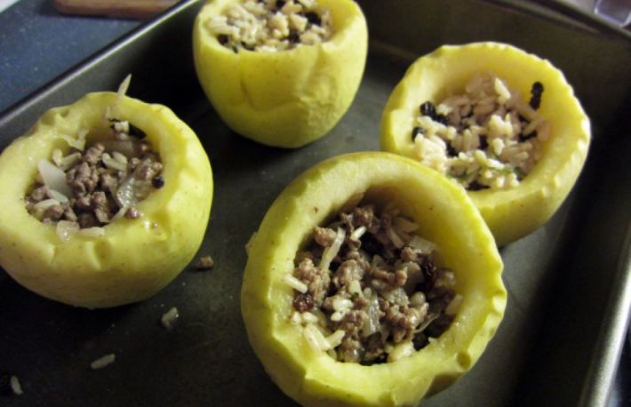 Daca v-ati asteptat la o reteta dulce cu mere, iata ca noi va propunem mere umplute cu carne macra (se foloseste la alegere carne de pasare sau de vita).