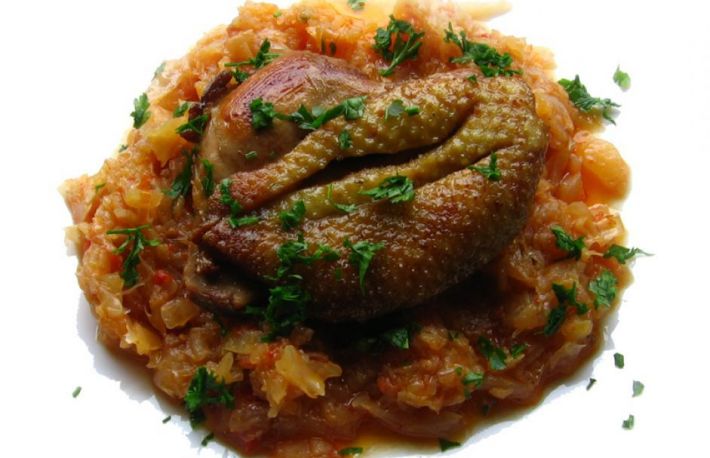 Se asaza varza pe farfurie si deasupra gasca taiata in bucati.