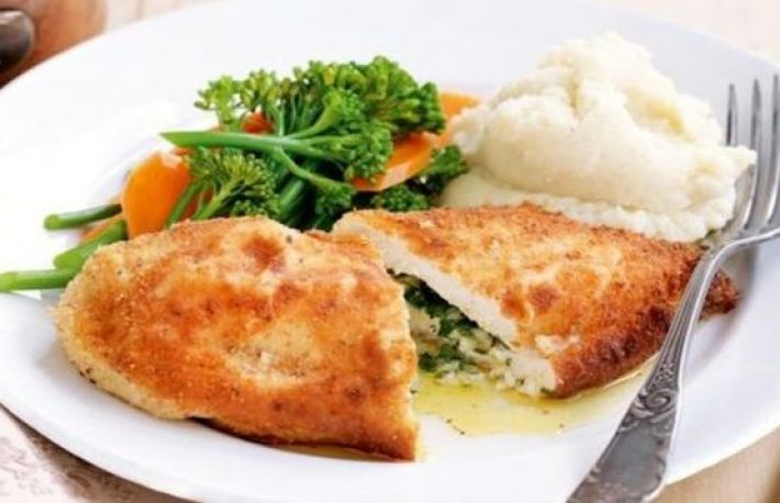 Puiul Kiev se va servi cu piure de cartofi si legume.