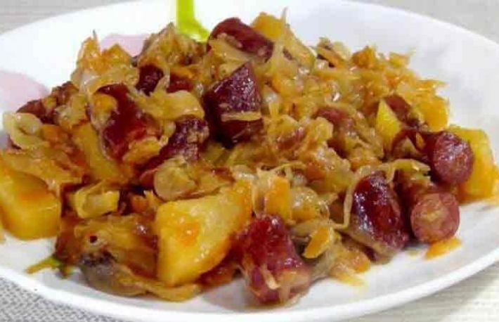 Varza inabusita cu cartofi, carnati si ciuperci. Mod de preparare: