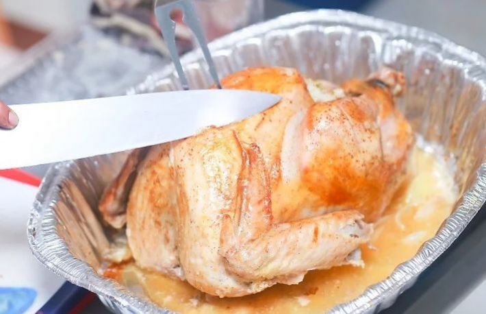 - introdu un termometru de bucatarie(pentru gatit) in curcan. Introdu acest termometru in pulpa, dar nu prea adanc( sa nu atinga osul).
