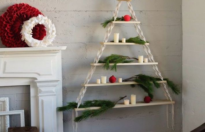 Rafturile de sarbatoare. Nu ai nicicum loc de un brad? Improvizeaza unul, la fel ca in imaginea de mai sus. Ai nevoie de cateva scandurele, cateva sfori si putina indemanare. La final, decoreaza constructia cu lumanari, luminite si crengute de brad.