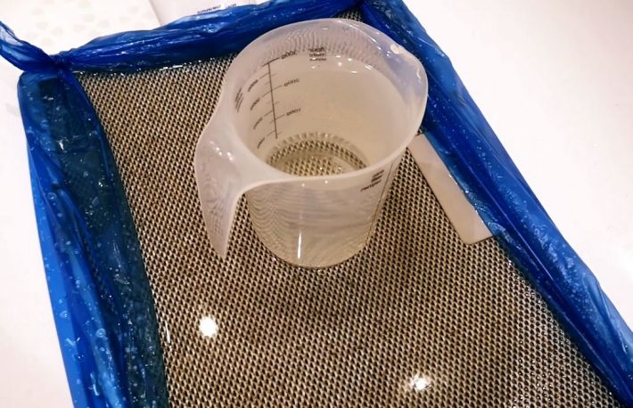 - muta plasa hotei intr-un recipient potrivit. Spre exemplu, pune plasa pe un sac mare de gunoi si innoada cele patru capete. Vei obtine o tavita pentru inmuierea plasei;