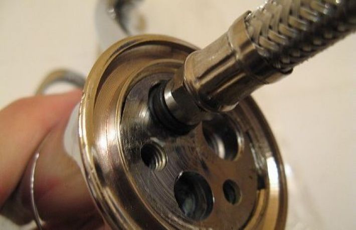 - Insurubati racordurile flexibile in baterie. Racordul cu fir rosu se infileteaza pe partea cu apa calda, iar cel cu fir albastru pe partea cu apa rece. Daca nu exista niciun fir nu conteaza ordinea.