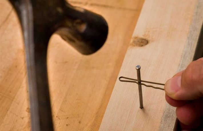 Agrafa si cuiele. Este usor sa-ti dai cu ciocanul in degete cand bati un cui, mai ales daca stai prost cu experienta in domeniu. Pentru a evita neplacerea, fixeaza cuiul intr-o agrafa. Aceasta va inlocui practic degetele. Dupa ce ai infipt putin cuiul si esti sigur ca nu mai fuge stanga-drepata, potirenunta la agrafa, continuand sa bati ciul atat cat ai nevoie.