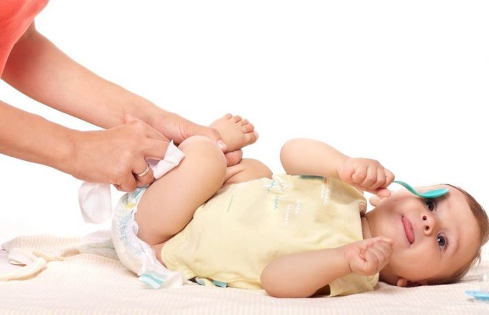 - ridica usor picioarele bebelusului si scoate scutecul murdar. Daca e cu fecale, impatureste-l si inchide-l cu benzile adezive pentru a evita mizeria.