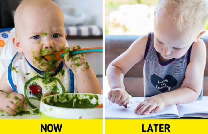 Castiga la capitolul independenta. Copiii exploreaza si dintr-un sentiment inca puin cunoscut de independenta. Este vorba de o dorinta subconstienta, dar care se contureaza cu fiecare experienta. Cand copilul tau, se murdareste pe toata fata cu alimentul preferat, jocul respectiv ii dezvolta capacitatea de gandire. Asadar, lasa-l pe ce mic sa manance in voie, avand, evident, grija sa nu se raneasca!