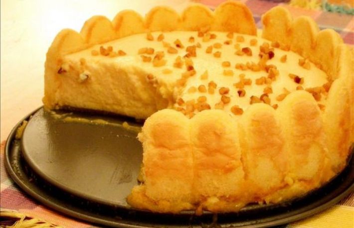 Se imbraca cu piscoturi o forma de tabla cu peretii drepti. Pentru fund se taie piscoturile in forma de triunghi, asezand varful triunghiurilor in mijlocul formei.