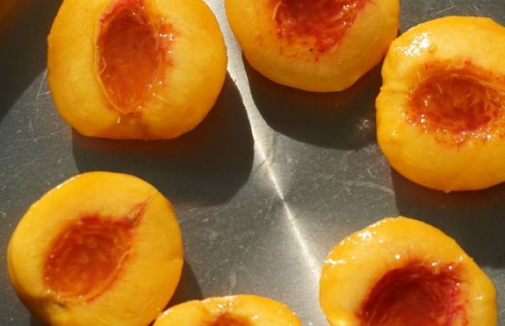 - pune feliile de piersici intr-o tava, intr-un singur strat.