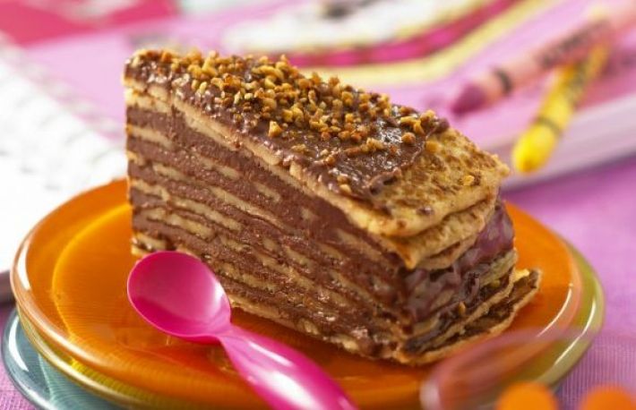 - monteaza tortul pe un platou. Aseaza clatita pe platou, peste care intinde crema de ciocolata si presara nuca pisata. Repeta procesul pana termini clatitele. Ultimul strat trebuie sa fie de clatita.