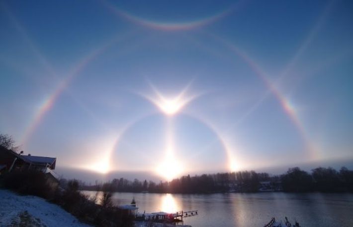 2. Haloul complex din Suedia (2017). Un fenomen rar si spectaculos a fost fotografiat in Jämtland, Suedia, incluzand multiple tipuri de halouri, precum Haloul de 22° si 46°, Parhelia (cainii solari) si Arcul circumzenital, considerat curcubeul inversat.