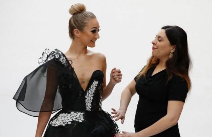 Zonele rochiei care isi schimba culoarea sunt realizate din grafen, un material cunoscut pentru rezistenta foarte mare si greutatea redusa. Grafenul este conductor de electricitate si poate fi facut transparent. Rochia dispune de o baterie minuscula incorporata.