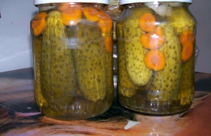 Pregatim borcanele astfel: punem pe fundul fiecarui borcan cateva boabe de mustar, doua rondele de morcov si una - doua rondele subtiri de ceapa. Asezam peste acestea castraveciorii spalati in prealabil.