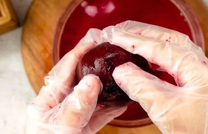 - elimina coaja de sfecla cu mana. Dupa procesul de racire, coaja de sfecla va fi moale si usor de indeparta chiar si cu unghia. Pune o pereche de manusi noi chirurgicale pe maini, pentru a nu te murdari;
