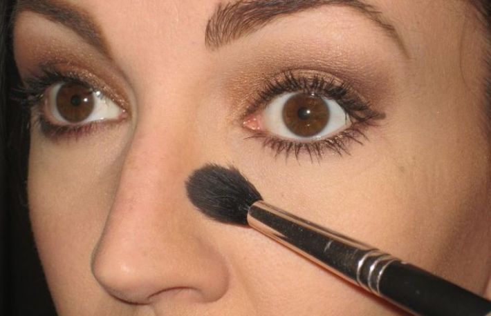 Tehnica de contouring. Cu ajutorul fardurilor de contouring, se realizeaza un joc de zone mai luminoase si mai intunecateprin care poti corecta anumite imperfectiuni ale tenului sau poti pune in valoare anumite trasaturi de care esti multumita. In ceea ce priveste nasul tau, corectura se face relativ usor.