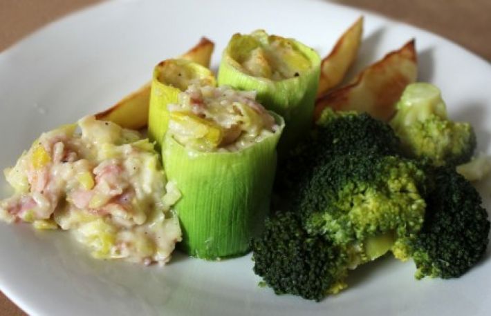 Se taie prazul bucati lungi de circa 6 cm si se trage cu grija miezul. Foile de deasupra raman in forma de tuburi care se umplu.