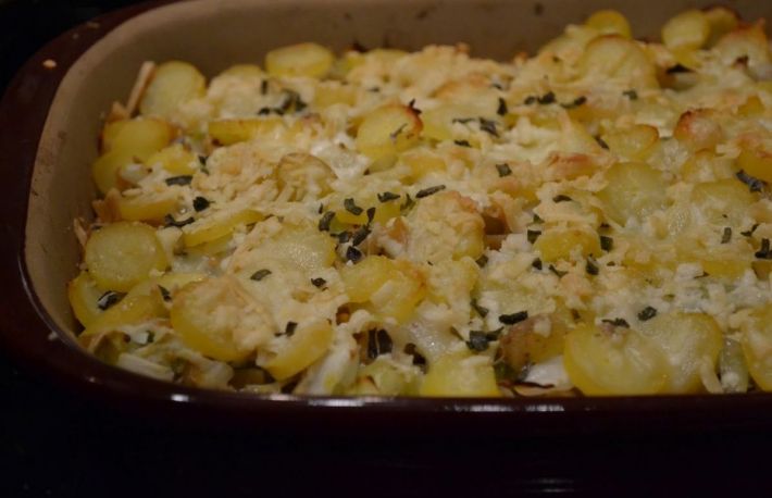 Se toarna deasupra smantana in care s-a adaugat un praf de faina si unul de sare, se presara deasupra branza rasa amestecata cu pesmet.