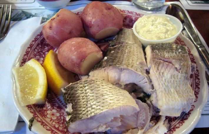 Pestele fiert se scurge de apa, se scoate pe o farfurie lunga si se curata de piele. Se serveste cu cartofi fierti si cu unt.