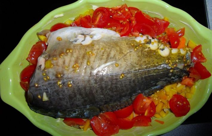Daca ai un peste mare curatat de solzi, mai departe nu ai nevoie de indemanare deosebita ca sa asezonezi crapul cu cateva legume si mirodenii.