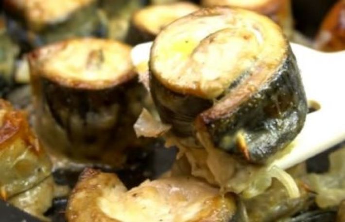 - pune un strat de ceapa taiata la baza tavii, apoi aranjeaza rulourile de macrou in randuri. Periaza-le cu sosul ramas;