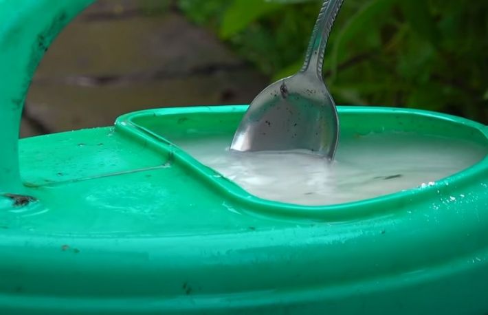 - amesteca toate ingredientele(apa statuta, creta, infuzia de iarba sau ureea/nitratul de amoniu. E necesar sa combini calciul cu azotul, pentru ca acesta sa se asimileze;