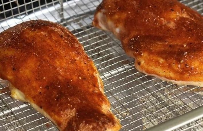 - aseaza fiecare piept de pui pe cosul tip gratar, cu un mic spatiu intre bucatile de carne. Cosul tip gratar trebuie sa se afle, evident, in tava tapetata cu folie de aluminiu;