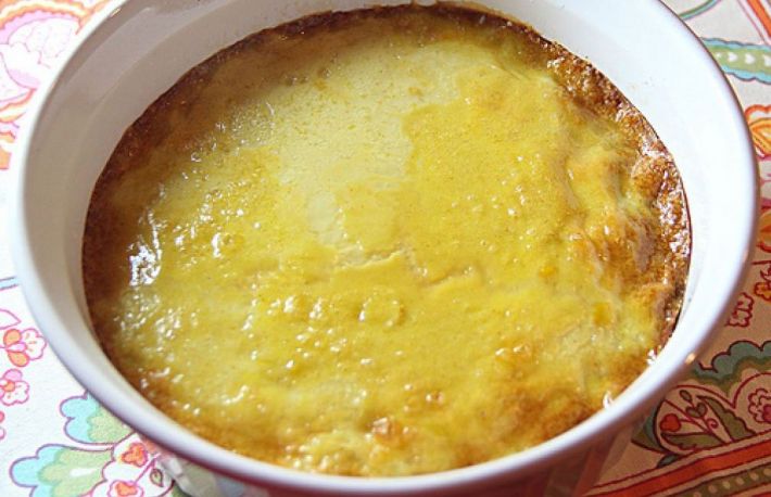 Se toarna compozitia intr-o forma imbracata cu zahar ars, se asaza in alt vas cu apa fierbinte si se fierbe la cuptor trei sferturi de ora.