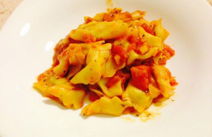 Se adauga condimentele oregano sau busuioc, sare si piper, dupa gust. Se amesteca si se adauga un polonic sau doua din apa in care a fiert ravioli.